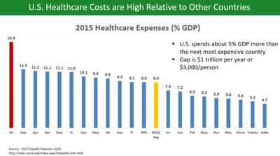 U.S. healthcare costs in 2015 were 16.9% GDP according to the OECD, over 5% GDP higher than the next most expensive OECD country.[4] With U.S. GDP of $19 trillion, healthcare costs were about $3.2 trillion, or about $10,000 per person in a country of 320 million people. A gap of 5% GDP represents $1 trillion, about $3,000 per person relative to the next most expensive country. In other words, the U.S. would have to cut healthcare costs by roughly one-third to be competitive with the next most expensive country.[5]