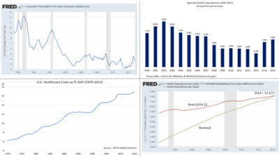 The Centers for Medicare and Medicaid (CMS) reported that U.S. health care costs rose 5.8% to reach $3.2 trillion in 2015, or $9,990 per person. As measured by CMS, the share of the U.S. economy devoted to health care spending was 17.8% GDP in 2015, up from 17.4% in 2014. Increases were driven by the coverage expansion that began in 2014 as a result of the Affordable Care Act (i.e., more persons demanding healthcare or more healthcare units consumed) as well as higher healthcare prices per unit.[3]