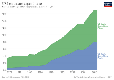 The Centers for Medicare and Medicaid (CMS) reported that U.S. health care costs rose to 17.8% GDP in 2015, up from 17.4% in 2014. Increases were driven by the coverage expansion that began in 2014 as a result of the Affordable Care Act (i.e., more persons demanding healthcare or more healthcare units consumed) as well as higher healthcare prices per unit.[3]