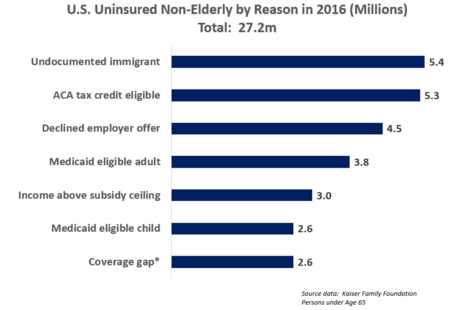 The percentage of persons without health insurance (the "uninsured") fell from 13.3% in 2013 to 8.8% in 2016, due primarily to the Affordable Care Act. The number of uninsured fell from 41.8 million in 2013 to 28.0 million in 2016, a decline of 13.8 million. The number of persons with insurance (public or private) rose from 271.6 million in 2013 to 292.3 million in 2016, an increase of 20.7 million. In 2016, approximately 68% were covered by private plans, while 37% were covered by government plans; these do not add to 100% because some people have both.[2]