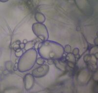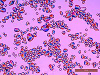 Examined under a microscope using a mixture of equal volumes of glycerol and distilled water, potato starch presents transparent, colorless granules, either irregularly shaped, ovoid or pear-shaped, usually 30 μm to 100 μm in size but occasionally exceeding 100 μm, or rounded, 10 μm to 35 μm in size. Starch granules exhibit characteristic dark crosses in polarized light. If potato starch is wetted it becomes sticky.