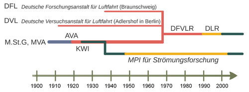The AVA was created in 1919 from the 1907 Göttingen by Ludwig Prandtl founded "Modellversuchsanstalt für Aerodynamik der Motorluftschiff-Studiengesellschaft". In its founding years, it was still concerned with the development of the "best" form of airship. In 1908, the first wind tunnel was built in Göttingen for tests on models for aviation. In 1915, founded in 1911 Kaiser Wilhelm Society (KWG) and under the direction of Ludwig Prandtl the "Modellversuchsanstalt aerodynamics" was founded in 1919 as the "Aerodynamic Research Institute of the Kaiser Wilhelm Society" (AVA) was transferred to the KWG and converted in 1925 into the "Kaiser Wilhelm Institute for Flow Research linked to the Aerodynamic Research Institute".