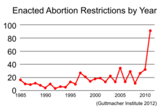 [10] The findings, according to the Guttmacher Institute, show that state restrictions on abortion greatly increased in 2011.