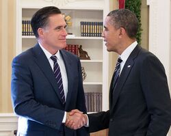 President Barack Obama and Mitt Romney shake hands in the Oval Office