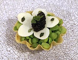 The essence of Foodpairing is to combine different foods that share the same major flavor components. Comparing the flavors of individual ingredients can result in new and unexpected combinations, such as strawberries paired with peas. This combination was adopted by Sang Hoon Decembre, the chef of L'Air du temps in Belgium.