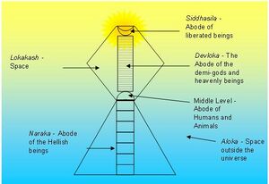 That portion of space in which all the substances are found is called the universe (lokakash). There are three types of Lokakasha; a) Urdhwa Lok, where beings of higher qualities than us live (Siddha Lok where liberated souls stay is at the top of Urdhwalok), b) Madhya Lok - where human beings and other creatures live, and c) Adho Lok, where the inmates of hell live (it has seven layers).