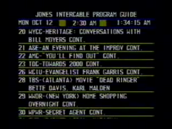 Both the EPG Jr. and EPG Sr. allowed cable operators to further customize their operation locally. Among other functions, the listings grid's scrolling speed could be changed and local text-based advertisements could be inserted. Each text-based advertisement could be configured to display as either a "scroll ad" (appearing within the vertically scrolling listings grid between its half-hour cycles)[1] or as a "crawl ad" (appearing within a horizontally scrolling ticker at the bottom of the screen).[2] If no advertisements were configured as "crawl ads," the bottom ticker would not be shown on-screen. The on-screen appearances of both the Jr. and Sr. versions of the EPG software differed only slightly, due primarily to differences in text font and extended ASCII graphic glyph character rendering between the underlying Atari and Amiga platforms.