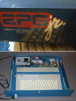 The Atari-based EPG Jr. units were encased in blue rack enclosures containing custom-made outboard electronics, such as the Zephyrus Electronics Ltd. UV-D-2 demodulator board, which delivered data decoded from the WGN data stream to the Atari's 13 pin SIO port (the EPG Jr. software's EPROM was interfaced to the Atari's ROM cartridge port).