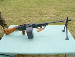 Light machine guns are designed to provide mobile fire support to a squad and are typically air-cooled weapons fitted with a box magazine or drum and a bipod; they may use full-size rifle rounds, but modern examples often use intermediate rounds. Medium machine guns use full-sized rifle rounds and are designed to be used from fixed positions mounted on a tripod. The heavy machine gun is a term originating in World War I to describe heavyweight medium machine guns and persisted into World War II with Japanese Hotchkiss M1914 clones; today, however, it is used to refer to automatic weapons with a caliber of at least 12.7 mm (0.5 in),[3] but less than 20 mm (0.8 in). A general-purpose machine gun is usually a lightweight medium machine gun that can either be used with a bipod and drum in the light machine gun role or a tripod and belt feed in the medium machine gun role.
