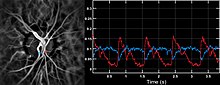 Blood flow velocity waveforms in the central retinal artery (red) and vein (blue), measured by laser Doppler imaging in the eye fundus of a healthy volunteer.