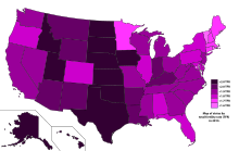 The total fertility rate in the United States after World War II peaked at about 3.8 children per woman in the late 1950s, dropped to below replacement in the early 70s, and by 1999 was at 2 children.[46] Currently, the fertility is below replacement among those native born, and above replacement among immigrant families, most of whom come to the United States from countries with higher fertility. However, the fertility rate of immigrants to the United States has been found to decrease sharply in the second generation, correlating with improved education and income.[47] In 2021, U.S. TFR was 1.8, ranging between over 2 in some states and under 1.6 in others.[15]