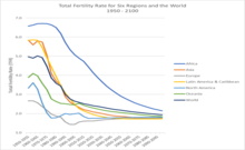 The chart shows that the decline in TFR since the 1960s has occurred in every region of the world and that the global TFR is projected to continue to decline for the remainder of this century.[28]