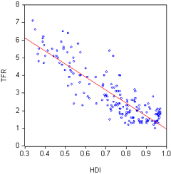 The effect of all these factors can be summarized with a plot of Total Fertility Rate against Human Development Index (HDI) for a sample of countries. The chart shows that the two factors are inversely correlated, that is, in general, the lower a country’s HDI the higher its fertility.