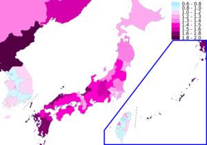 Singapore, Macau, Taiwan, Hong Kong, and South Korea have lowest-low fertility, defined as TFR at or below 1.3, and are among the lowest in the world.[28] Macau had a TFR below 1.0 in 2004.[35] North Korea has the highest TFR in East Asia at 1.95.[28]