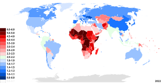 This region has a TFR of 4.4, the highest in the world.[28] Niger, Angola, Congo, Mali, and Chad are the highest.[15] The most populous country in Africa, Nigeria, had an estimated TFR of 4.7 in 2021.[15] The second most populous country, Ethiopia, had an estimated TFR of 4.1 in 2021.[15]