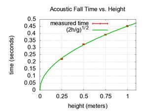 | Distance d traveled by an object falling for time t where g is gravitational acceleration (~ 9.8 m/s2): | [math]\displaystyle{ \ d=\frac{1}{2}gt^2 }[/math] |