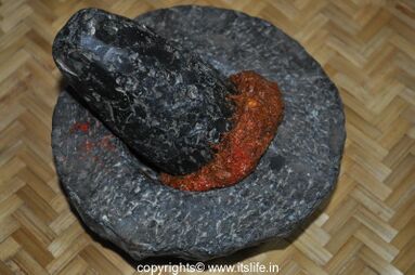Before grinding, both parts are washed and cleaned. Ingredients to be ground are placed on flat surfaced stone. Heavy round or cylindrical or oval stone is then rolled to and fro on the ingredients to grind them.