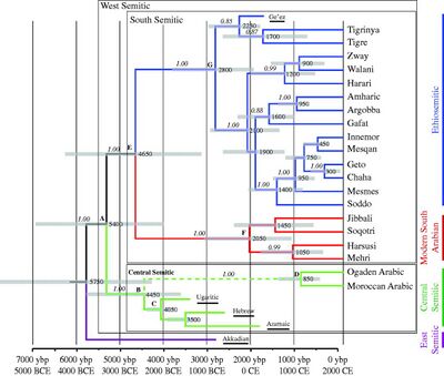 - ↑ Kitchen, Andrew; Ehret, Christopher; Assefa, Shiferaw; Mulligan, Connie J. (29 April 2009). "Bayesian phylogenetic analysis of Semitic languages identifies an Early Bronze Age origin of Semitic in the Near East". Proceedings of the Royal Society B: Biological Sciences 276 (1665): 2703–2710. doi:10.1098/rspb.2009.0408. PMID 19403539.