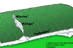 The description klinge for small V-shaped valleys may derive from the noise of the streams when in spate (klingen in German means "ring" "clang" or "jingle"). Another interpretation maintains that the little valleys were supposed to be cut by blades ("Klinge" = blade). In the whole of southwest Germany, including the Swabian and Franconian Jura, this sort of valley is known as a Klinge, Tobel or Klamm.[1]