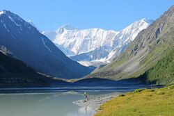 The source of the black Biya River is Lake Teletskoye, the region's largest lake located in an isolated area far south in the mountains. The emerald-colored Katun River has its source at the Gebler glacier, which is situated on the Republic's highest point, Mount Belukha. The Katun River, in particular, holds a religious significance for native Altaians, as well as for many Russians who live in the area, as Mount Belukha is known in Altai folklore to be the gateway to the mystical kingdom of Shambhala.[13]