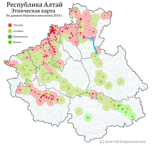 As per the 2021 Census,[20] ethnic Russians make up 53.7% of the republic's population, with the indigenous Altai people making up 37.0%. Other groups include people of Kazakh (6.4%), together with smaller groups, each accounting for less than 0.5% of the total population.