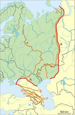 Red line "A" was once commonly accepted in Russia and Kazakhstan during the Soviet Union era.[citation needed] However, the commonly accepted modern definition mostly fits with the lines "B" and "F" in this image.[citation needed]