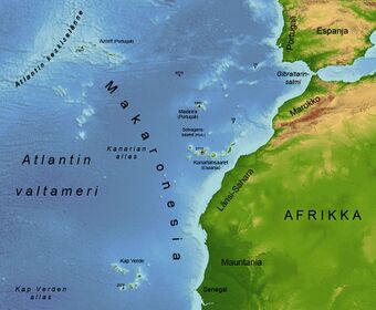 The Portuguese Atlantic island possession of the Azores is 1,368 km (850 mi) from Europe and 1,507 km (936 mi) from Africa, and is sometimes grouped with Europe. By contrast, the Canary Islands and the Madeira islands (the latter of which also include the Desertas Islands and the Savage Islands) off the Atlantic coast of Morocco are much closer to, and usually grouped with, Africa; the Canary Islands are only 100 km (62 mi) from the African mainland at their closest point but 945 km (587 mi) from the European mainland, while Madeira is 520 km (320 mi) from the African mainland and 1,000 km (620 mi) from the European mainland.[12] In his 1895 book Africa: Volume 2, author Augustus Henry Keane remarked, "In the North Atlantic there are four insular groups — Madeira, the Canaries, Cape Verde and Azores — which are usually assigned to Africa, although the Canaries and Cape Verde alone belong geographically to that continent, the Azores are lost, so to say, in mid-Atlantic."[13]