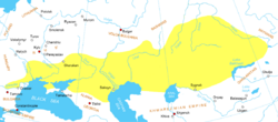 The pre-Scythian inhabitants of the steppe may have been Cimmerians who may have been a Thracians-Iranian mix with an Iranian elite. From around the ninth century BC the nomads of the western steppe are described as Scythians (800 BC – 100 BC). They spoke an Iranian language and may have been the first to develop horse nomadism. Herodotus said that Scythians drove the Cimmerians from north of the Caucasus into Anatolia (about 700 BC), but this has been questioned. From around the second century BC the Sarmatians (c. 500 BC – 400 AD?) replaced the closely related Scythians, either as an ethnonym or ruling group. The Siraces (300 BC – 200 AD) were a group of Hellenized Sarmatians who lived along the Kuban. To their east and north were the Aorsi (100 BC – 100 AD), also a Sarmatian group. In the first and second centuries AD the Alans (100 AD – 1239) came from the east and took over from the Sarmatians. Since the Sythians, Sarmatians and Alans spoke similar languages the names may represent different dominant groups ruling similar people. From about 370 AD the Huns (376-469) overthrew the Alans, but many Alans continued to live in the area and later re-emerged. As a result of the Hun attack many Alans moved west and joined the Huns and Goths in attacking the Roman Empire. Around 600 AD the Western Turkic Kaganate took over the lower Volga – perhaps the first appearance of Turkic languages in this area. The obscure Sabir people (c. 460 – 700s), who may have been Turkic, lived near the Caspian. After 630 the Khazars (c. 630 – 969), who had a Turkic-speaking ruling class, formed a state mainly on the lower Volga which lasted until it was destroyed by the Rus’ about 969. Around 635 the Turkic Bulgars (c. 480–1014) were established west of the Khazars. The Alans re-formed a state (c. 700 – 1240) in Kabardia which was Christianized by the Byzantines. The rise of Islam led to the Arab-Khazar Wars (642-737) and in 737 Arabs briefly reached the lower Volga. The Pechenegs (c. 800 – 1100) moved from north of the Caspian into this area perhaps around 850. They pushed or were pushed westward and were eventually broken up in wars with the Byzantines. Behind them came the Cumans – Kipchaks (?-1241), two peoples that are hard to distinguish. Like the Pechenegs they continued west and fought the Rus’ and Byzantines. The appearance of the Kipchaks may mark the final establishment of Turkic languages north of the Black Sea.