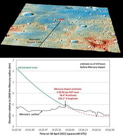 The mission was designed to clear up six key issues: Mercury's high density, its geological history, the nature of its magnetic field, the structure of its core, whether it has ice at its poles, and where its tenuous atmosphere comes from. To this end, the probe carried imaging devices that gathered much-higher-resolution images of much more of Mercury than Mariner 10, assorted spectrometers to determine the abundances of elements in the crust, and magnetometers and devices to measure velocities of charged particles. Measurements of changes in the probe's orbital velocity were expected to be used to infer details of the planet's interior structure.[202] MESSENGER's final maneuver was on April 24, 2015, and it crashed into Mercury's surface on April 30, 2015.[203][204][205] The spacecraft's impact with Mercury occurred at 3:26:01 p.m. EDT on April 30, 2015, leaving a crater estimated to be 16 m (52 ft) in diameter.[206]