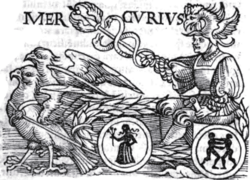 The ancients knew Mercury by different names depending on whether it was an evening star or a morning star. By about 350 BC, the Ancient Greece had realized the two stars were one.[19] They knew the planet as Στίλβων Stilbōn, meaning "twinkling", and Ἑρμής Hermēs, for its fleeting motion,[20] a name that is retained in modern Greek (Ερμής Ermis).[21] The Romans named the planet after the swift-footed Roman messenger god, Mercury (Latin Mercurius), whom they equated with the Greek Hermes, because it moves across the sky faster than any other planet.[19][22] The astronomical symbol for Mercury is a stylized version of Hermes' caduceus; a Christian cross was added in the 16th century: