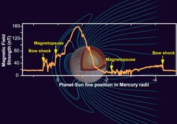 The spacecraft made three close approaches to Mercury, the closest of which took it to within 327 km (203 mi) of the surface.[193] At the first close approach, instruments detected a magnetic field, to the great surprise of planetary geologists—Mercury's rotation was expected to be much too slow to generate a significant dynamo effect. The second close approach was primarily used for imaging, but at the third approach, extensive magnetic data were obtained. The data revealed that the planet's magnetic field is much like Earth's, which deflects the solar wind around the planet. For many years after the Mariner 10 encounters, the origin of Mercury's magnetic field remained the subject of several competing theories.[194][195]