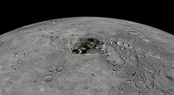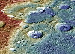 A "rimless depression" inside the southwest rim of the Caloris Basin consists of at least nine overlapping volcanic vents, each individually up to 8 km (5.0 mi) in diameter. It is thus a "compound volcano".[76] The vent floors are at least 1 km (0.62 mi) below their brinks and they bear a closer resemblance to volcanic craters sculpted by explosive eruptions or modified by collapse into void spaces created by magma withdrawal back down into a conduit.[76] Scientists could not quantify the age of the volcanic complex system but reported that it could be on the order of a billion years.[76]