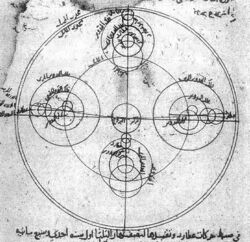 In medieval Islamic astronomy, the Andalusian astronomer Abū Ishāq Ibrāhīm al-Zarqālī in the 11th century described the deferent of Mercury's geocentric orbit as being oval, like an egg or a pignon, although this insight did not influence his astronomical theory or his astronomical calculations.[161][162] In the 12th century, Ibn Bajjah observed "two planets as black spots on the face of the Sun", which was later suggested as the transit of Mercury and/or Venus by the Maragha astronomer Qotb al-Din Shirazi in the 13th century.[163] Most such medieval reports of transits were later taken as observations of sunspots.[164]