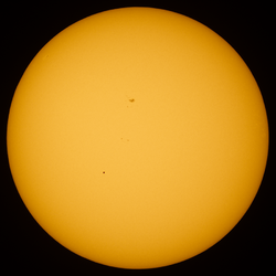 Mercury's orbit is inclined by 7 degrees to the plane of Earth's orbit (the ecliptic), the largest of all eight known solar planets.[110] As a result, transits of Mercury across the face of the Sun can only occur when the planet is crossing the plane of the ecliptic at the time it lies between Earth and the Sun, which is in May or November. This occurs about every seven years on average.[111]