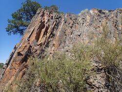 Particles of volcanic ash that are sufficiently hot will weld together after settling to the surface, producing a welded tuff. Welding requires temperatures in excess of 600 °C (1,100 °F). If the rock contains scattered, pea-sized fragments or fiamme in it, it is called a welded lapilli-tuff. Welded tuffs (and welded lapilli-tuffs) can be of fallout origin, or deposited from ash flows, as in the case of ignimbrites.[16] During welding, the glass shards and pumice fragments adhere together (necking at point contacts), deform, and compact together, resulting in a eutaxitic fabric.[17] Welded tuff is commonly rhyolitic in composition, but examples of all compositions are known.[18][19]