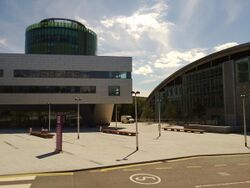 The campus extends to 23 hectares (57 acres), although some of this is currently landscaped parkland, undeveloped, or under construction. In addition, the university owns a further 8 hectares (20 acres) of land to the west (primarily woodland) and 22 hectares (54 acres) at Waterside Farm on the opposite bank of the River Dee.[23]