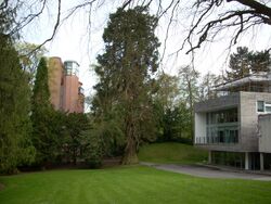 In 1955, the Technical College received a large gift of land. Local Architect, property developer and entrepreneur Tom Scott Sutherland, purchased the Victorian manor and estate of Garthdee House in 1953 on the outskirts of the city. Finding himself and his wife living out of only four rooms in the enormous mansion, he donated it and the estate in 1955 for a new school of architecture.[5] These classes had taken place at Gray's School of Art, but had been expanding in the 1940s and 1950s and much more space was needed. Following completion of a modern extension to the house, the new Scott Sutherland School of Architecture opened in 1957. In 1966, Gray's School of Art also moved to a large new building on this estate, freeing its Schoolhill building for administrative use. By 2013, all activities had transferred to Garthdee, with the addition of land immediately adjacent purchased from Aberdeen City Council in the 1990s.[5]