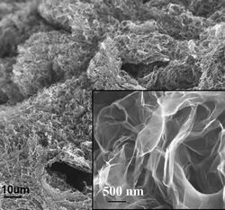 Graphene foam is a solid, open-cell foam made of single-layer sheets of graphene.[1][2] It is a candidate substrate for the electrode of lithium-ion batteries.