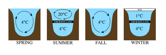 The thermal stratification of lakes refers to a change in the temperature at different depths in the lake, and is due to the density of water varying with temperature.[5] Cold water is denser than warm water and the epilimnion generally consists of water that is not as dense as the water in the hypolimnion.[6] However, the temperature of maximum density for freshwater is 4 °C. In temperate regions where lake water warms up and cools through the seasons, a cyclical pattern of overturn occurs that is repeated from year to year as the cold dense water at the top of the lake sinks (see stable and unstable stratification). For example, in dimictic lakes the lake water turns over during the spring and the fall. This process occurs more slowly in deeper water and as a result, a thermal bar may form.[5] If the stratification of water lasts for extended periods, the lake is meromictic.