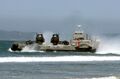A US Army LACV-30 (Lighter Air Cushion Vehicle - 30 Ton) hovercraft transporting ground-support military equipment to the shore in 1986.