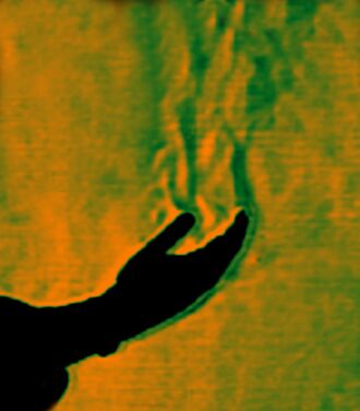 The air next to a human is heated, resulting in gravity-induced convective airflow, which results in both a velocity and thermal boundary layer. A breeze disrupts the boundary layer, and hair and clothing protect it, making the human feel cooler or warmer. On an aircraft wing, the velocity boundary layer is the part of the flow close to the wing, where viscous forces distort the surrounding non-viscous flow. In the Earth's atmosphere, the atmospheric boundary layer is the air layer (~ 1 km) near the ground. It is affected by the surface; day-night heat flows caused by the sun heating the ground, moisture, or momentum transfer to or from the surface.