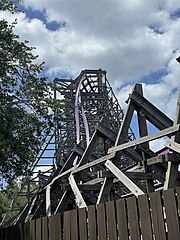 A camelback or camelback hill is a hump-shaped hill that travels in a straight line designed to lift riders out of their seats and provide a feeling of weightlessness, commonly known as airtime.[4][5] It produces negative g-force to achieve the effect.[6][7] The term has been used to describe a series of smaller hills typically found near the end of a track's layout, which is a common finale on older wooden coasters.[7][8] A modern coaster's implementation of a camelback can be a much larger, single hill often found earlier in the track's layout.[4][9]
