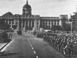 Adolf Hitler and the Nazi Party created a second fascist dictatorship in Germany in 1933,[86] obtaining absolute power through a combination of electoral victory, violence, and emergency powers.[87] Other nationalist movements in Europe established dictatorships based on the fascist model.[76] During World War II, Italy and Germany occupied several countries in Europe, imposing fascist puppet states upon many of the countries that they invaded.[88] After being defeated in World War II, the far-right dictatorships of Europe collapsed, with the exceptions of Spain and Portugal. The Soviet Union occupied nationalist dictatorships in the east and replaced them with communist dictatorships, while others established liberal democratic governments in the Western Bloc.[76]