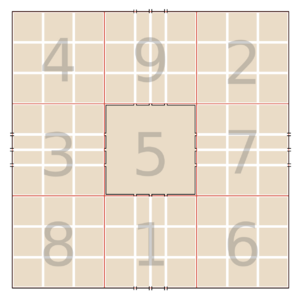 There are several cosmologically significant features of this basic urban outline, including cardinal orientation, square shape, (implied) centrality of the ruler's palace, grid structure, and the prominence of the number nine. The nine-by-nine grid has led some scholars to suggest that the plan is based on the cosmological belief that the Earth is a square divided into nine sections. This structure is reproduced by the magic square, a tool for divination.
