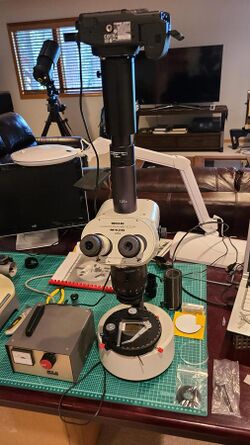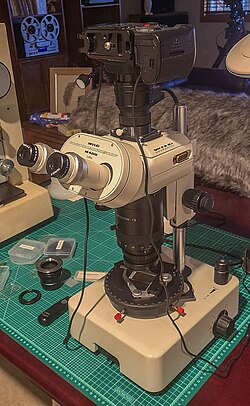 The macroscope outwardly resembles a binocular microscope (stereo microscope) but has a single light path in place of the dual light paths of the latter, which is relayed as an identical image to both eyepieces, and optionally, a camera port. In the Wild era it was offered as the M400, M410, M420 and M450 instruments,[2][3][4] subsequently sold as the Leica M420 only.[5] Optimised for macro photography in particular (since the camera path passed through the centre of the imaging lens, thereby offering the best optical performance), the instrument was not intended for mass sale but for specialised technical use, such as in universities and research laboratories, for example for production of images for use in scientific publications, or for inspection and production control for microscopic circuits, etc., in the semiconductor industry. In addition to their generally good optical performance, macroscopes offer a large, fixed working distance independent of magnification setting between the bottom of the objective lens and the subject, which is advantageous for manipulation of the specimens and/or introduction of supplementary lighting, etc. A further benefit of the macroscope principle (in contrast to the stereo microscope) is there is no parallax error (apparent lateral shift of the specimen) when acquiring "z-stacks" or focus stacked images for subsequent merging.[6]