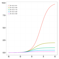 - [math]\displaystyle{ C }[/math]: typically takes a value of 1. Otherwise, the upper asymptote is [math]\displaystyle{ A + {K - A \over C^{\, 1 / \nu}} }[/math]