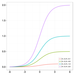 - [math]\displaystyle{ K }[/math]: the right horizontal asymptote when [math]\displaystyle{ C=1 }[/math]. If [math]\displaystyle{ A=0 }[/math] and [math]\displaystyle{ C=1 }[/math] then [math]\displaystyle{ K }[/math] is called the carrying capacity;
