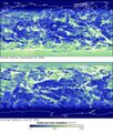 The globe on an equirectangular projection to show the amount of reflected sunlight at southern and northern summer solstices, respectively (watts / m2).