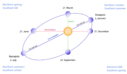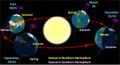 Diagram of the Earth's seasons as seen from the south. Far left: northern solstice