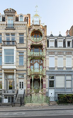 From the Place Royale/Koningsplein, the Rue de la Régence/Regentschapsstraat crosses the Sablon/Zavel Quarter (French: Quartier des Sablons, Dutch: Zavelwijk),[23] made of the larger Grand Sablon/Grote Zavel ("Large Sablon") square in the north-west[24] and the smaller Petit Sablon/Kleine Zavel ("Small Sablon") square and garden in the south-east,[25] divided by the Church of Our Blessed Lady of the Sablon.[26] It is a swanky district, where an antiques market is held, and in which antique and art dealers, as well as other luxury shops, have their businesses. Not far from there stood the Art Nouveau Maison du Peuple/Volkshuis by the famous architect Victor Horta, until its demolition in 1965. The Sablon is also home to the Egmont Palace[27] and the Royal Conservatory of Brussels.[28]